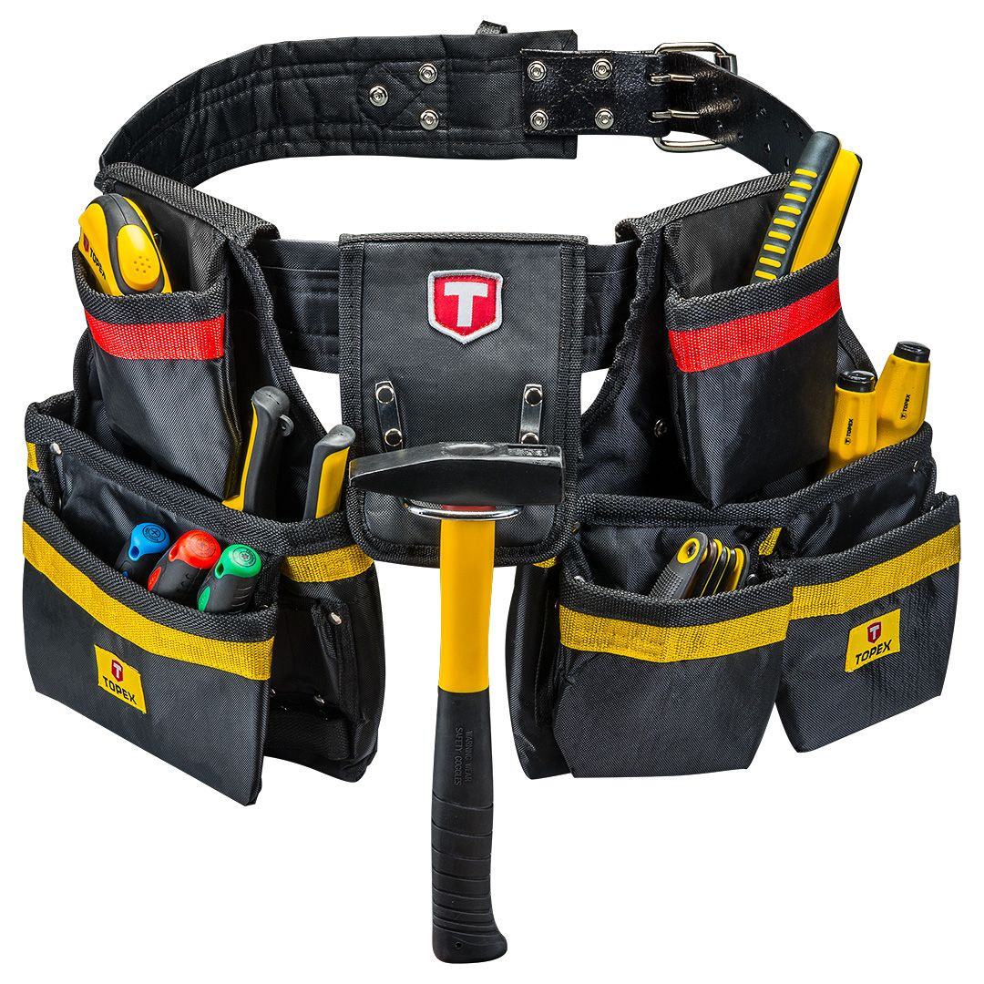 Centură tâmplărie TOPEX din material plastic rezistent. Centura are 21 de buzunare întărite pentru o cantitate portabilă mare de instrumente sau accesorii. Centura este reglabilă în intervalul de 33-55", care oferă posibilitatea de a se adapta la silueta utilizatorului. Marca TOPEX se adresează meșterilor.