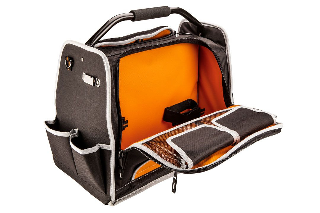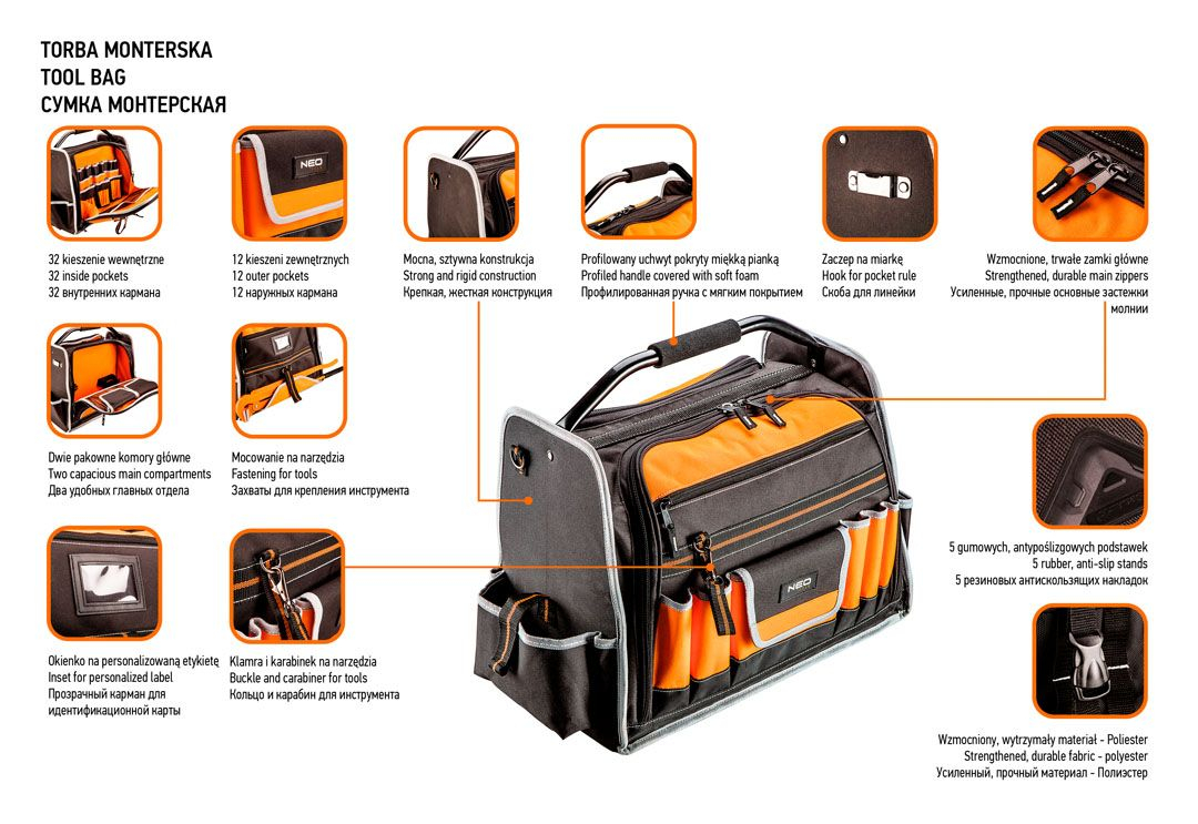 Geanta pentru scule Neo (nr. ref. 84-301) realizată din poliester 600 D, asigurând durabilitatea pe termen lung a genții. Deține un fund căptușit cu bare, pentru a proteja conținutul în timpul condițiilor dure. Geanta este echipată cu un mâner robust și curea de transport. Marele avantaj al acesteia este multitudinea de buzunare 12 externe și 32 interne. Marca Neo îndeplinește așteptările profesioniștilor.