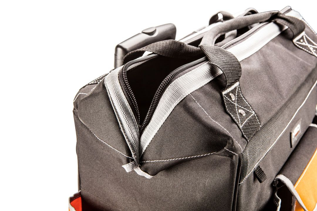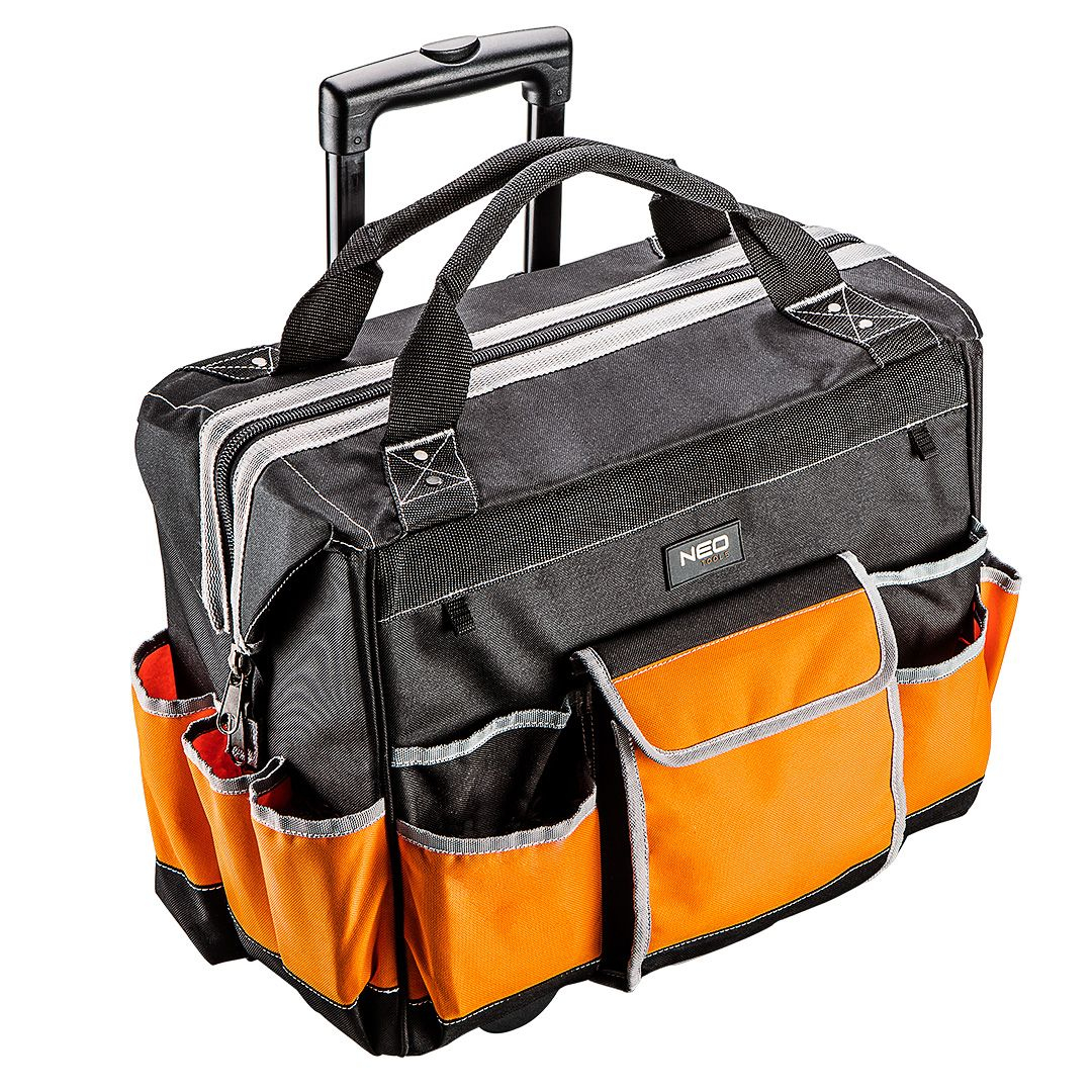 Geantă pentru scule pe roți Neo (nr ref. 84-302), fabricată din poliester durabil 600 D, asigurând durabilitatea pe termen lung a genții. Deține o construcție rigidizată și cusături și fermoare întărite. Mânerul telescopic cu blocare, împreună cu roțile puternice facilitează transportul de conținut greu. Geanta este echipată cu un mâner puternic consolidat cu nituri. 11 buzunare interioare și 6 exterioare, împreună cu un compartiment principal mare ce permite depozitarea și transportul mai multor instrumente. Marca Neo îndeplinește așteptările profesioniștilor.