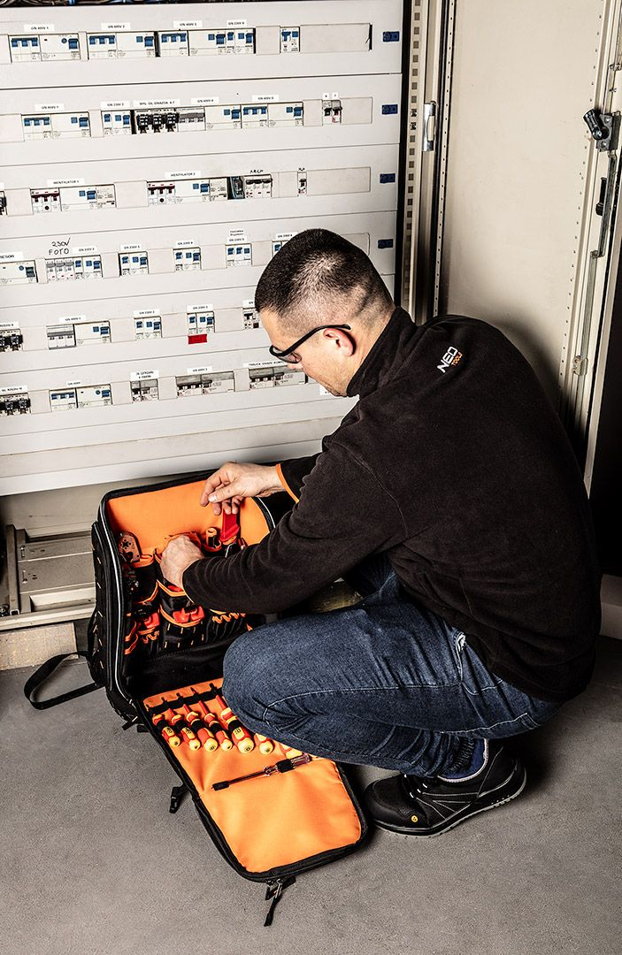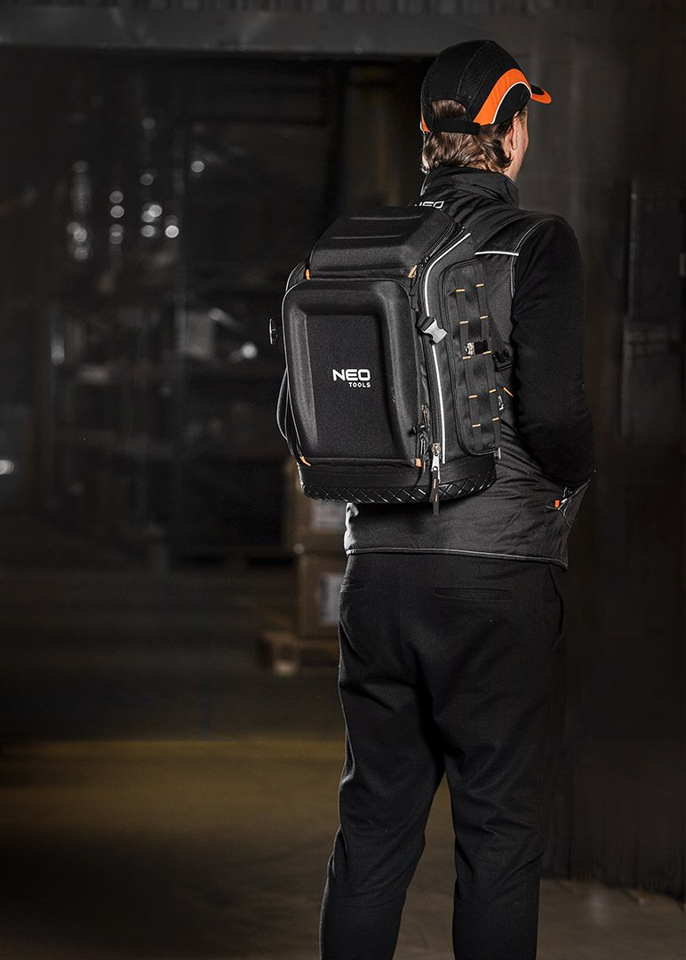 Rucsacul pentru scule NEO, cu intarituri 84-329 de la NEO TOOLS este un rucsac incapator si robust cu intarituri suplimentare, pentru numeroase aplicatii. Este caracterizat de o capacitate de pana la 20 de litri si dimensiuni: 370 mm latime, 275 mm adancime si 515 mm inaltime. Are un compartiment principal cu 4 buzunare externe si 35 interne, oferind spatiu de depozitare pentru multe unelte sau accesorii. Cu baza cauciucata si cadrul rigid, ofera stabilitate si siguranta. Materialul poliester 600 D protejeaza continutul rucsacului de umiditate si contaminare externa. Rucsacul pentru unelte NEO TOOLS este recomandat profesionistilor si pasionatilor de bricolaj.