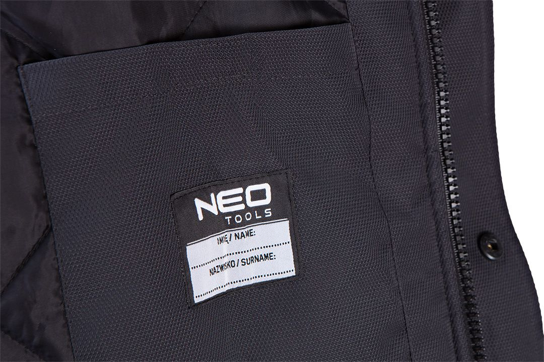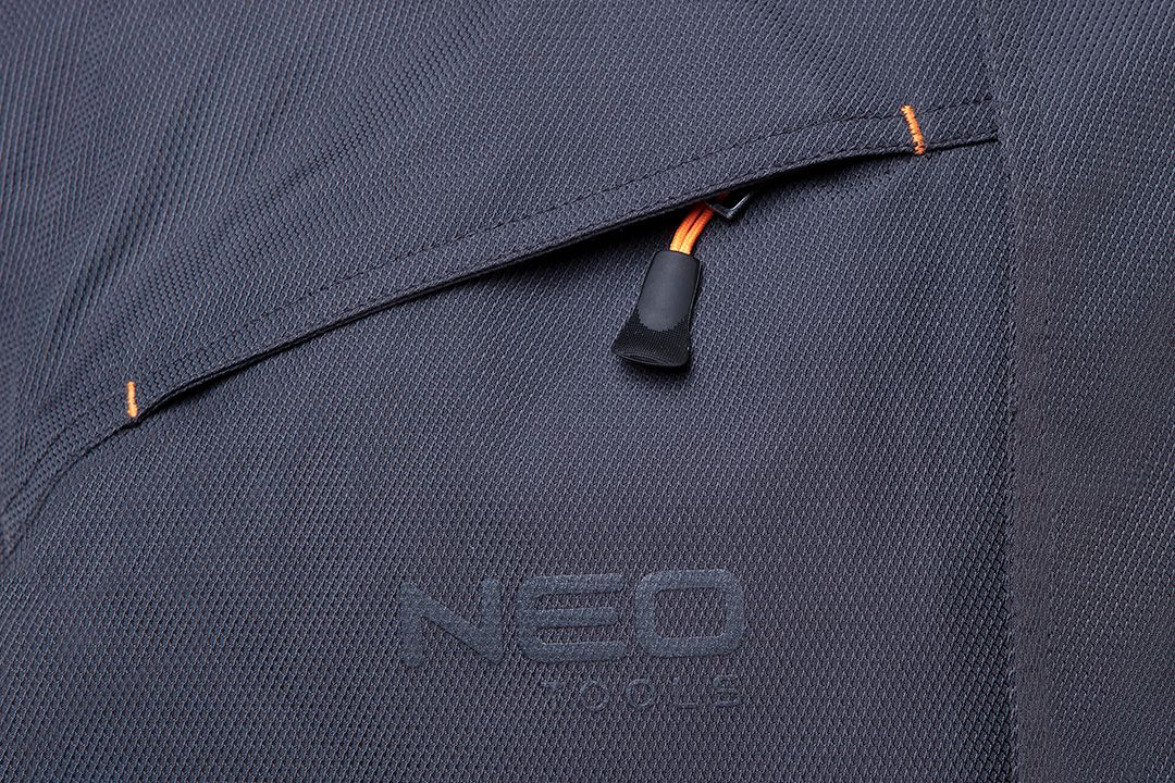 Jacheta de lucru Neo OUTDOOR are un strat de membrană pentru impermeabilizare și confort termic. A fost confecționată din țesătură rezistentă de tip dobby. Jacheta are două buzunare sub croială: la piept și la umăr, ambele cu fermoar, și buzunare laterale. Gluga călduroasă poate fi ascunsă în guler. Mânecile sunt reglabile și au o bandă elastică la manșetă. Banda reflectorizantă de pe guler se duce până la mâneci. Produsul este certificat CE. Este disponibil în mărimile S-XXXL.