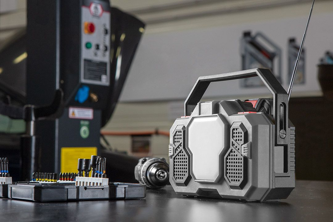 pentru ascultarea muzicii și a știrilor la un loc de muncă solicitant - pe pe șantierul de construcții, în atelier sau în atelierul de producție,