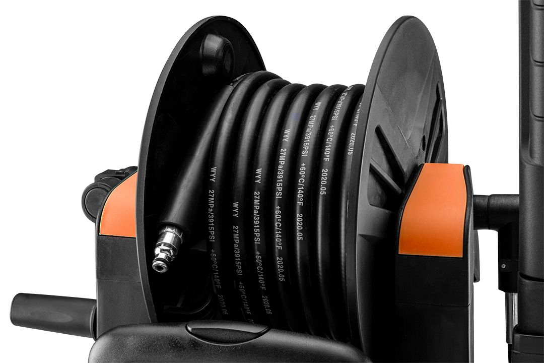 Echipat cu echipat cu o mâner de pistol confortabil, permite controlul complet al jetului de apă. curent de apă. Mașina de spălat vine cu un set de accesorii practice, Mașina de spălat vine cu un set de accesorii practice, inclusiv un furtun de înaltă presiune de 5 m lungime pentru o muncă confortabilă, Rolă pentru depozitare ușoară, suport pentru echipamente sau rezervor practic pentru detergent rezervor de detergent practic.